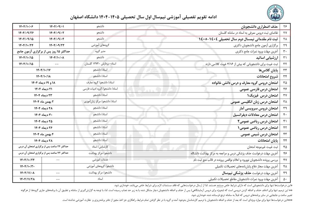 ✅چنانچه دانشجو شرایط فوق را داشته باشد، طبق تقویم تفصیلی آموزشی نیمسال اول سال تحصیلی 05-1404 دانشگاه اصفهان باید از روز