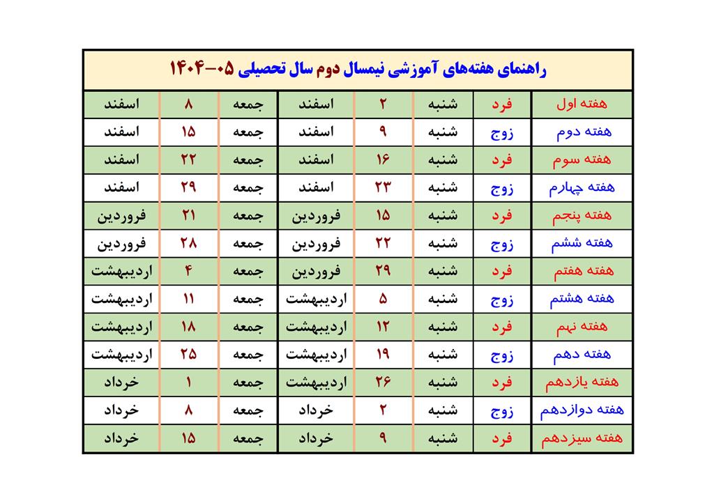 راهنمای هفته های آموزشی نیمسال دوم سال تحصیلی 05-1404