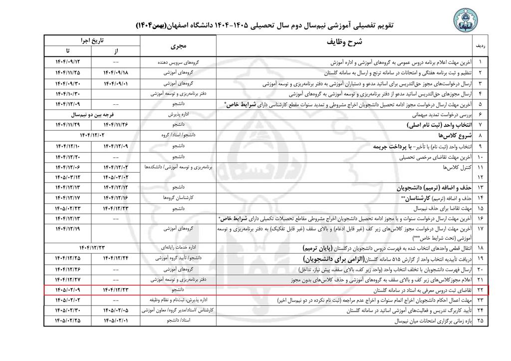 ✅چنانچه دانشجو شرایط فوق را داشته باشد، طبق تقویم تفصیلی آموزشی نیمسال دوم سال تحصیلی 05-1404 دانشگاه اصفهان باید در